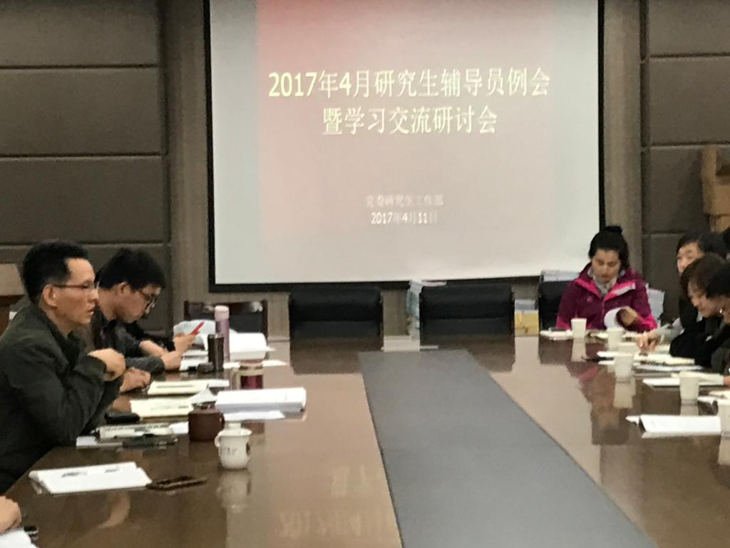 4月11日,研究生工作部举行了2017年4月研究生工作例会暨研究生辅导员专题学习交流会,会议由研究生工作部副部长姚志友主持。